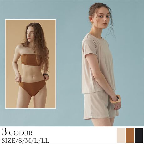 着心地の良いリブ素材のTシャツ×ショートパンツ付きビキニ。