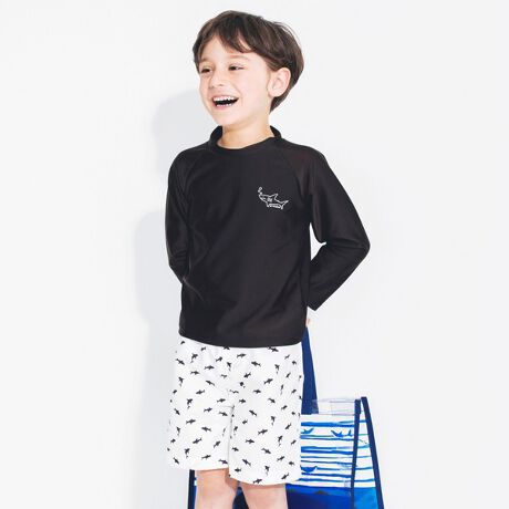 長袖ラッシュガードとサーフパンツのセットが新登場!強い日差しの中での水遊びでも、長袖ラッシュガードでしっかりUVカット!サメをモチーフにしたデザインで、ラッシュガードの胸元にはサメのイラストが、サーフパンツにはサメのシルエットが総柄となって入っています。サーフパンツの内側には目の細かい生地のインナーショーツがついており、肌当たりも優しい仕様となっております。プールサイドでも海辺でも、お子さまを見つけやすいこと間違いなしの鮮やかなエメラルドグリーンと、モノトーン配色がかっこいいブラックの2色をご用意しました。−−−−−ラッシュガード透け感:なし伸縮性:あり裏地:なしサーフパンツ透け感:なし伸縮性:なし裏地:インナーパンツありポケット:あり※モデル着用写真についてはイメージの為、実際の 商品とカラーや仕様が異なる場合がございますので、 商品画像をご覧ください。※商品の色味につきまして、お客様のお使いのPCの モニター環境により実際のカラーと画像の色味が 違って見える場合が御座います。 予めご了承の上、ご注文下さい。※店頭・外での撮影画像は光の加減で、 実際の商品より明るく見える場合が御座います。子ども/子供/こども/子供服/キッズ/ジュニア/男の子/女の子