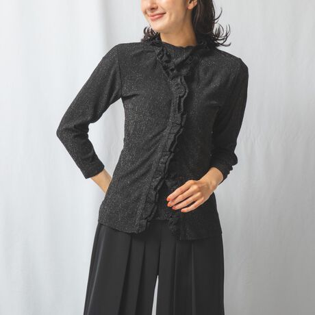 楊柳見えのシャーリングを掛けたカットソー素材を使用したカットソーフリルブラウス。さりげないラメが入っていているのが特徴的。比翼仕立ての前開きなのでこれからの時期、羽織としても活躍。同素材のシャーリングカットソーノースリーブプルオーバー(30-21-35-916)とアンサンブルとしても着用可能です。\n\n・透け感あり\n・ストレッチあり\n・カラー展開はグレー、ブラック、ブルー\n・サイズ展開は1(M)9号・3(2L)13号