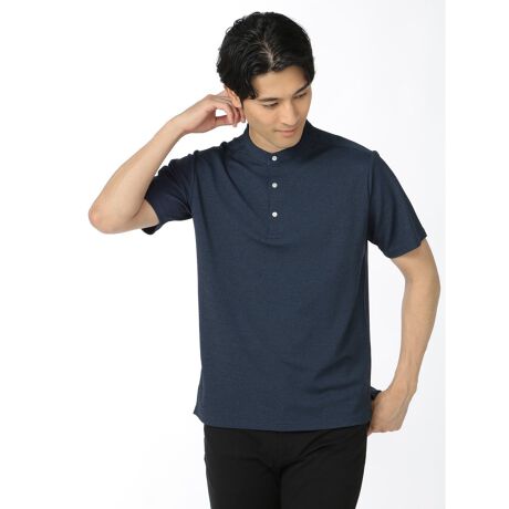 シンプルな無地の半袖Tシャツです。スタンドカラーをベースに衿元をヘンリーネックにして上品に仕上げています。夏の一枚着としてはもちろんジャケットインにもぴったりです。