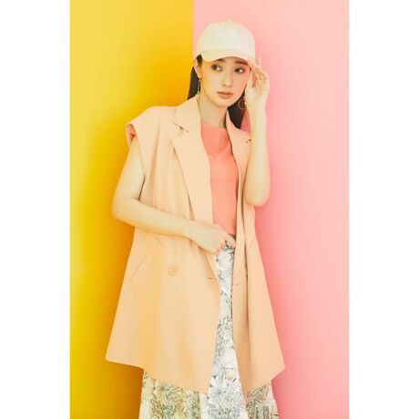 スリーブレスのデザインが今時なテーラードジレ。前を開けた際にゆったりとしたサイジングで抜け感を演出してくれます。あえて下側の釦をとめるデザインが、襟を大きく魅せスタイリッシュな印象に仕上げました。また大きな釦がジャケットの顔を引き締めて、羽織るだけで様になる様にバランスにも拘りました。上品な素材感ですが細やかなツイル目のある生地を使用し、キレイ目にもカジュアルにもモードにも、多様なイメージに合わせ易い生地もPointです。爽やかな印象のWHT、今どき感溢れるL/ORG、多様なシーンで着られるBLKの3色展開です。