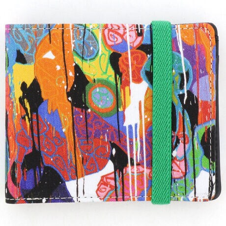 グラフィックアーティストJONONE(ジョンワン)とのコラボレーションから、研ぎ澄まされた色彩感覚で周囲の目を奪う2つ折りウォレットが登場。ストリートアートをルーツとするJONONEらしい、バンドで留めるラフなデザインです。