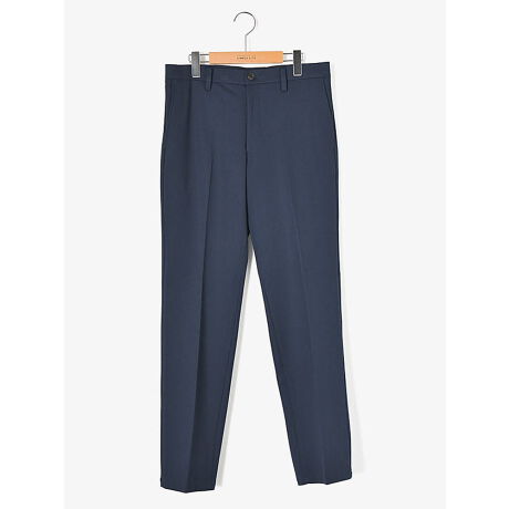 しなやかでハリのあるハイゲージスムースのジャージ素材を採用したセミテーパードスラックス。ネイビーベースの編地にツイル織柄をプリントしファブリック感を演出しています。キレイ目とリラックス感を兼ね備えたパンツで、ウエストは伸縮性のあるインベルを使うことで程よい伸度を備えています。膝抜けを考慮した膝裏付き仕様。