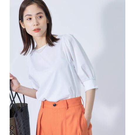 袖に大き目なタックをとることで、ボリューム感のある袖が特徴のカットソー。身頃のシルエットはスッキリとしたシルエットですのでボトムインも可能。オンオフどちらにもお使いいただける汎用性の高いトップスです。ブラウス見えするカットソーで、品の良い艶感がありカジュアル見えしないのでお仕事でもきちんと見えする素材とデザインです。