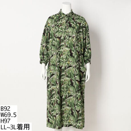 [型番:23155]麻調合繊素材にボタニカル柄プリント施したシャツワンピース、ポリエステル素材でありながら麻の様なサラサラ感のある素材、夏らしいリゾートボタニカル柄プリント、