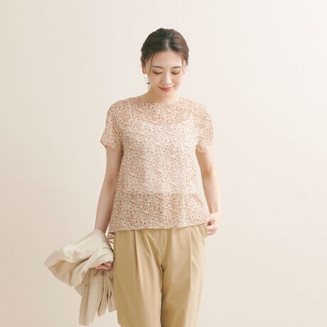 軽やかな素材にフローラルプリントをあしらったショートスリーブブラウス。プリントは1986年にリバティのために手描きされたデザイン。お祝いの花を咲かせる可憐な小枝と輝くローズヒップの実が描かれた柄が繊細でほんのりレトロな雰囲気に。バックネックはボタン仕様。