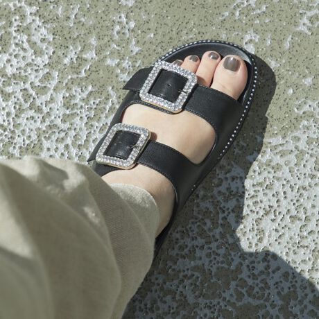ベルトに大ぶりのビジューバックルを合わせたファッション性の高いキャッチーな一足。押しぶちにもラインストーンをあしらって華やかさをプラス。バックル下にゴムがついているので、歩行時の食い込みも少なく、履き心地の良さも魅力です。