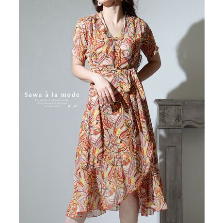 【ワンピース】オレンジ 半袖 ワンピ ペイズリー柄 カシュクール 膝丈 アシンメトリー ワンピ 上品