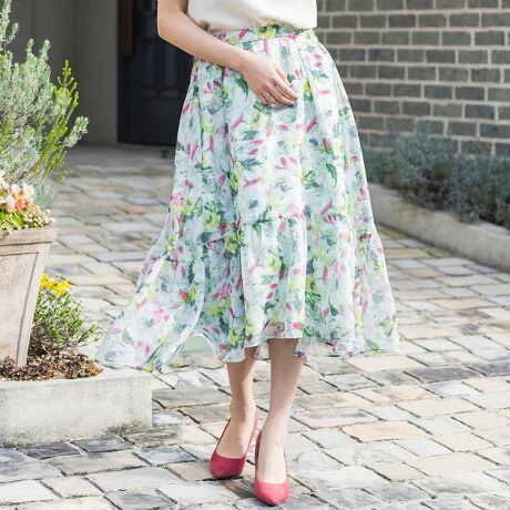 ソフトオーガンジーに乗せた優しい水彩風のフレアスカート