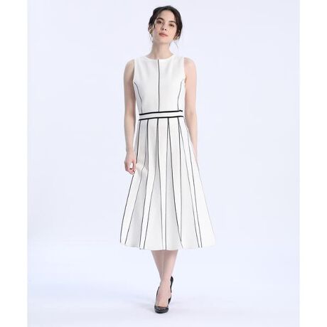 M Maglie le cassetto定番のニットワンピース。女性らしいノースリーブにウエストから広がる立体的なスカートが特徴的で、縦に入ったバイカラーのラインがスタイルアップを叶えます。バイカラーのラインが浮き上がったように見せる技法はMade in Japanだから出来る表現方法。ハリとコシがありながらも、軽さとストレッチ性も兼ね備えた素材で着心地も申し分なく、お出掛けや特別なシーン、オフィスにもぴったりのワンピースです。同素材のカーディガンを合わせてセットアップ風にお召しいただくのもおすすめです。・裏地なし・後ろファスナーあり・水洗い可セットアップで着られるカーディガン品番:5122178217■サンプル撮影商品■こちらの商品はサンプルでの撮影となっております。実際の商品とは、サイズや色味、素材、デザイン等の仕様が若干変更になる場合がございます。
