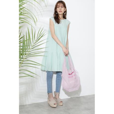 コットンシフォンを使用した、夏らしく軽やかなミニ丈ワンピース肩先にかかるほどのノースリーブなので品よく、バックリボンが大人かわいいポイントです。柔らかく軽い素材感とふわっとしたシルエットが魅力で、一枚でも下にスリムパンツと合わせて、チュニック風にも着られます。