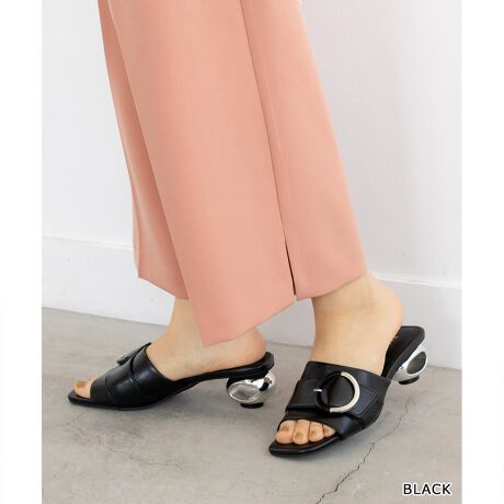 印象的なメッキ変形ヒールがポイントのミュールサンダル
