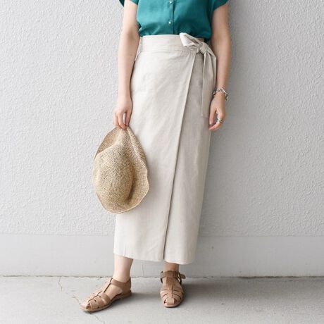 ・麻混のラスティックな素材でラップ風スカートを作りました。