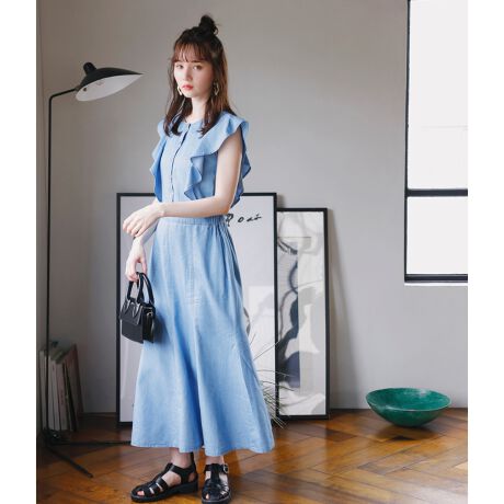 【WEB限定】デニム&ツイルノースリーブマーメイドフレアワンピース