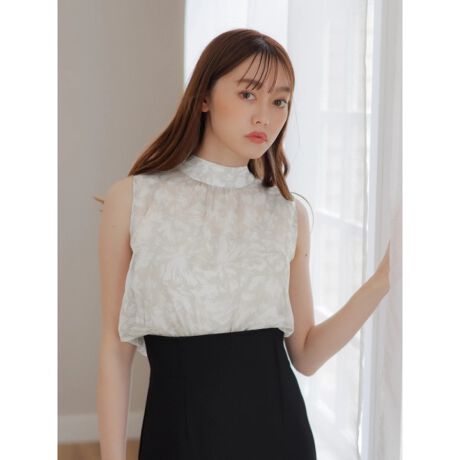 シアーなシフォンにエレガントなフラワープリントをあしらったノースリーブブラウス。