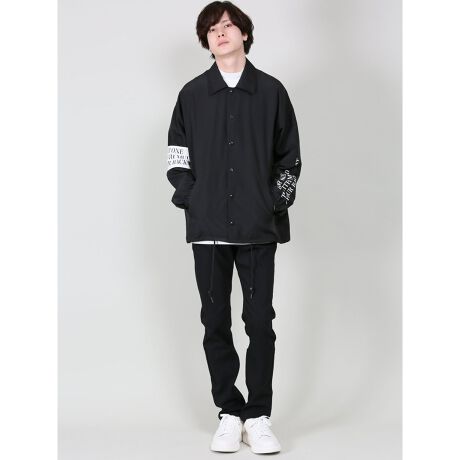 バックプリントが存在感抜群のコーチジャケットです。取り外し可能な腕章と安全ピン付きで、その日の気分によってカスタマイズできるデザインになっています。袖口はシャーリング仕様。裾にスピンドル入り。ポケット付き。今っぽいスポーツ感やストリートテイストを演出するのに最適なアイテムです。