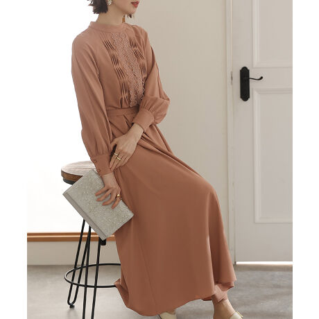 ■タックデザイン×スカラップ刺繍がクラシカルなロングワンピース