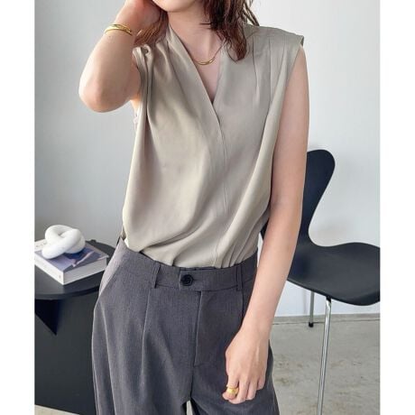 首のラインに沿った衿からすっと深く切り込んだVネックが特徴のノースリーブトップス♪
