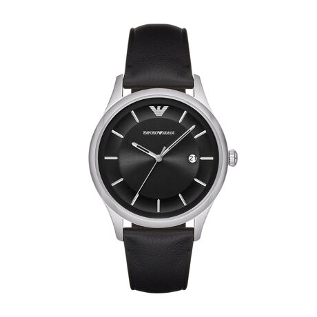 Emporio Armaniのメンズウォッチ。日付ウィンドウ付きのブラックサンレイダイヤルと、そこにあしらわれたインデックスが、洗練された多次元の感覚をもたらします。ステンレススチールケースとマットブラックレザーストラップでエレガントなルックスに仕上げました。