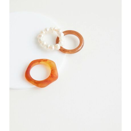 ・ニュアンスたっぷりなマーブルカラーのアクリルリング2つと、パールビーズを連ねたリング1つをセットに。