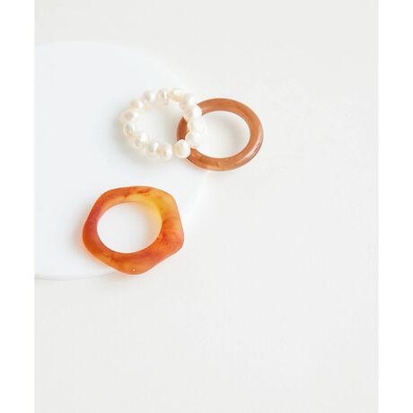 ・ニュアンスたっぷりなマーブルカラーのアクリルリング2つと、パールビーズを連ねたリング1つをセットに。