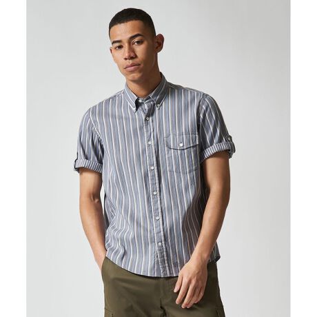 ■素材細番手のしなやかで上品な糸を使用し、二重織りで表のカラーと裏のカラーを変えたマルチストライプをオリジナルで開発しました。裏のカラーが表にも影響するため、深みのある独特の見え感とより鮮やかでポイントになる裏側の見え感が特徴的です。■デザイン定番のレギュラーボタンダウン、パッチフラップモデルです。素材の特性を余すことなく表現したロールアップスリーブ仕様です。