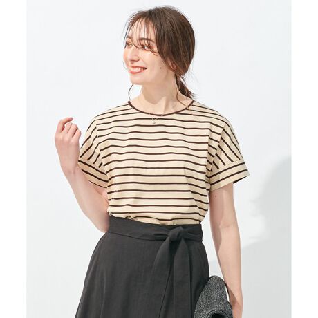 大人のカジュアルスタイルを叶える、ボーダートップス■デザイン袖口の切り替えや背中のタックが印象的なデザイントップス。大人らしいシックな色展開。スカートにもパンツにも合わせやすい丈と身頃感で使いやすい1枚です。体から離れるシルエットなので、涼しくボディラインを気にせず着用できます。フロントをタックインしても決まりやすい脇のスリットもポイントです。■素材毛羽と抑えたコンパクト綿を使用したハイゲージの天竺ボーダー素材です。しっかりと編目を詰めているので、シロ部分が透けにくく、さらっとした手触りで暑い時期に着やすい素材です。これからの季節に嬉しい、UV加工素材。■同素材アイテムボートネックデザイン(KKWMNX0636)※採寸情報はサンプル商品のデータです。実際の商品と仕様が異なる場合がございます。※画像はサンプルのため実際の商品と仕様が異なる場合がございます。