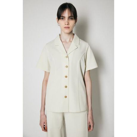 【HALF SLEEVE SHIRT JACKET】女性らしいウエストフィットのシルエットが美しい夏向けのジャケットです。つるっとした表面感の綺麗な素材なので、スニーカーやキャップなどメンズライクな小物合わせでハズしていただきたい1枚。 同素材でパンツのお作りもございます。