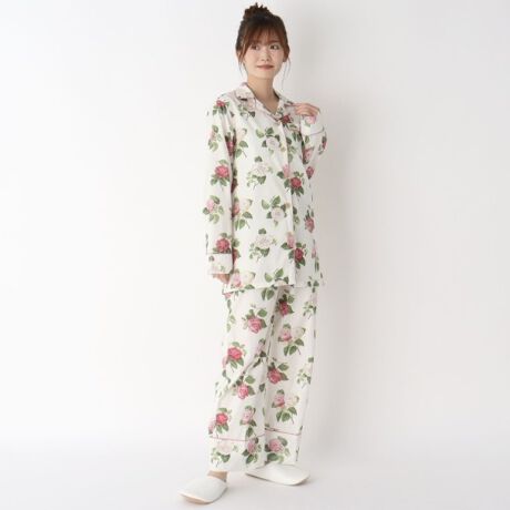 エレガントな紅白のバラをモチーフにしたカミール柄をプリントしたお部屋時間が華やかに楽しくなるパジャマ。