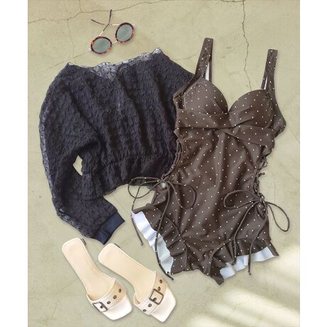 シアーな透け感のトップスとワンピースがセットになったスイムウェア。
