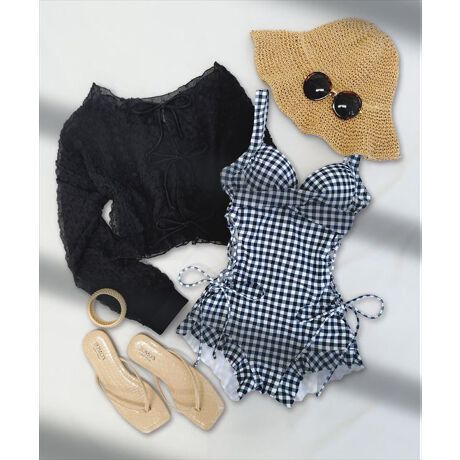シアーな透け感のトップスとワンピースがセットになったスイムウェア。