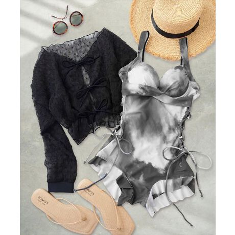 シアーな透け感のトップスとワンピースがセットになったスイムウェア。