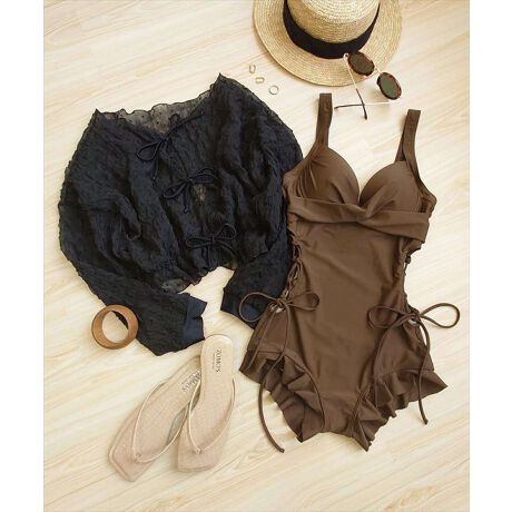 シアーな透け感のトップスとワンピースがセットになったスイムウェア。