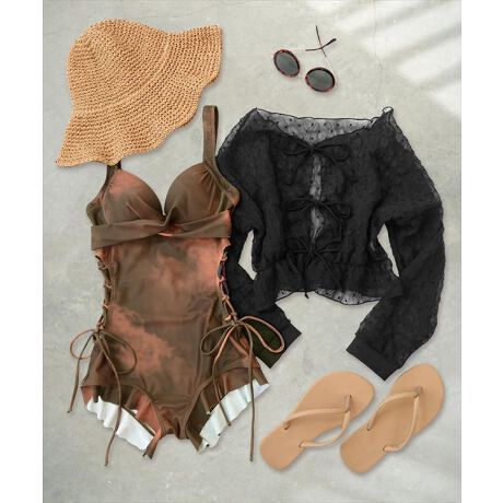 シアーな透け感のトップスとワンピースがセットになったスイムウェア。