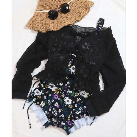 シアーな透け感のトップスとワンピースがセットになったスイムウェア。