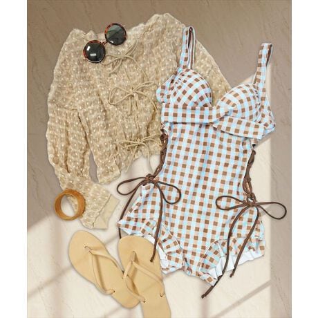 シアーな透け感のトップスとワンピースがセットになったスイムウェア。