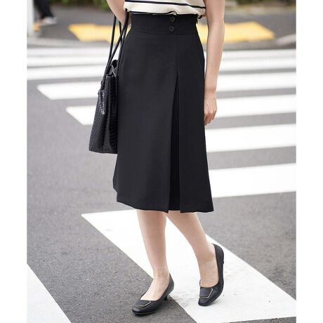 シンプルシルエットで合わせるトップスを選ばないスカート。後ろのみゴム仕様のウエストは飾りボタンを施した幅広のウエストヨークでトップインスタイルもより綺麗に魅せてスタイルアップさせてくれます。タックを入れたシルエットはタイトすぎないバランスの良い広がりで品のある印象に。デイリーからオフィススタイルまで幅広く活躍してくれるアイテムです。