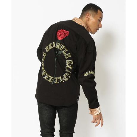 襟・カフス部分にベロアを使い、ラグジュアリーな雰囲気漂うシャツ。背中に入ったブランドロゴサークル、ローズデザインが◎春夏のトップスとして活躍するデザイン性あるアイテムです。EXAMPLE/エグザンプル(全ては自分次第)様々なジャンルをミックスして着るのが当たり前になった近年。これからもそのファッションスタイルは消える事はないが組み合わせる事でルーツやカルチャーが邪魔をしてしまい、見た目が良くても合わせたアイテムに対し「違和感」ができる事もある。誰が見てもその「違和感」という概念を取り除けるブランドがあれば自分次第でもっとファッションという幅が広がるのではないか。何に合わせても「1つの例」になるようなアイテムを提供できるブランドを目指します。