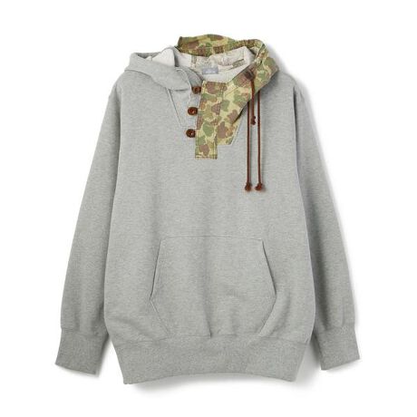 kolor / BEACONグレーのテキスタイルにカモフラージュ柄がアクセントになっているパーカー。フードの半分にカモフラージュ柄の生地をあしらい、フロントはボタンやジップを配置したユニークなデザインです。ゆとりのあるリラックスフィットで、M/L相当の2サイズ展開です。デニムやチノパン、ハーフパンツ、カーゴパンツなどさまざまなテイストのボトムスと好相性です。kolor / BEACONコンセプトに捉われない自由な服作りによって「進化していくブランド」『kolor / BEACON』は、異素材の組み合わせやギミックなど手の込んだデザインに定評がある「kolor」とは異なり、シンプルな素材や付属使いが特徴だ。中には、過去のコレクションからセレクトし今の気分で作り変えたというシャツもある。ナイロンとレザーの吉田カバン製デイパックや、ウェットスーツ素材とスウェードのデザートブーツなど、ハイブリットなデザインとカラーリングで遊び心を効かせた小物も展開している。カラー(kolor)は日本のファッションブランド。メンズ・ウィメンズともに展開している。デザイナーの阿部潤一(Junichi Abe)は1965年生まれ。文化服装学院アパレルデザイン科でファッションを学ぶ。卒業後、いくつかのアパレルメーカーを経て、2004年、独立し、自身のブランド「カラー(kolor)」を設立。2005S/Sからコレクションをスタート。パターン、素材、縫製のバランスにこだわった、時代の気分にフィットするデザインが人気となっている。阿部が手掛ける独創的な色使いと斬新な素材の開発への評価は高い。2009年7月、東京南青山にフラッグシップショップをオープン。2012-13A/Wコレクションよりパリ・メンズファッションウィークでコレクションを発表している。2012年「第30回毎日ファッション大賞」大賞受賞。同年、新しいメンズブランド「kolor BEACON」を立ち上げた。2013年6月、ピッティ ウォモにてメインゲストデザイナーに選ばれ、2014S/Sメンズコレクションを発表した。