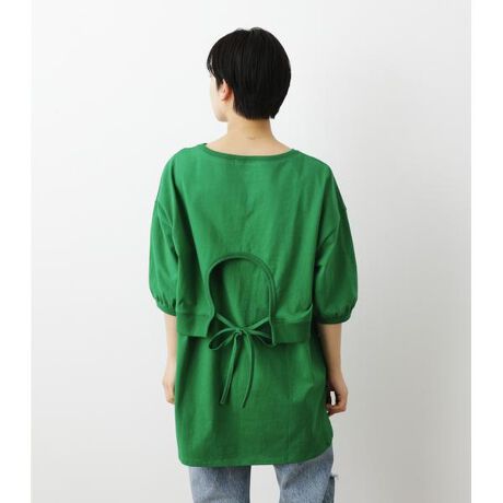 [型番:420FSL80-030B]バックのレイヤード風デザインがポイントのトップス。長めの5分丈半袖でこれから暖かくなるこの時期にぴったり。1枚でもオシャレに決まるデザイントップスです。