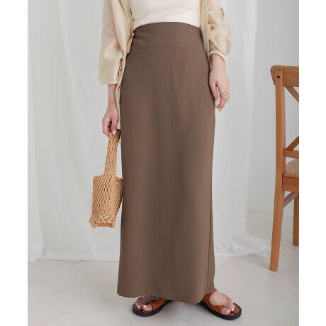カラー展開と落ち感のある素材できれいなシルエットを実現したシンプルなペンシルタイプのスカート。ウエスト部分の切り替えを幅広めにして後ろをシャーリングゴムにすることでおなか周りをすっきり見せることが可能になっています◎