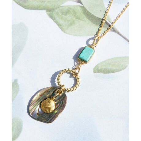 ワイスチャームの【涼しげなシェル素材】シェル×ターコイズネックレス(ゴールドフィルド)。