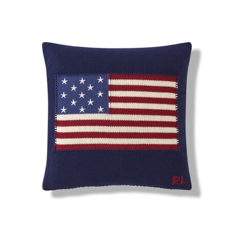 [型番:HMRLBEDHR220204]セーターからインスパイアされた綿ニットのクッションカバーは、フラッグ部分が編み地、星の部分は刺繍、フラッグの周りにはハンドステッチというこだわりのデティールです。