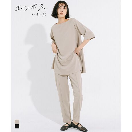 ウエストも適度な余裕があり裾丈もジャストで足のラインが綺麗に見えます。他のエンボス生地シリーズも持っていますが速乾でアイロン不要、傷みにくく丈夫な生地、伸びもいい等、本当にストレスフリーです。