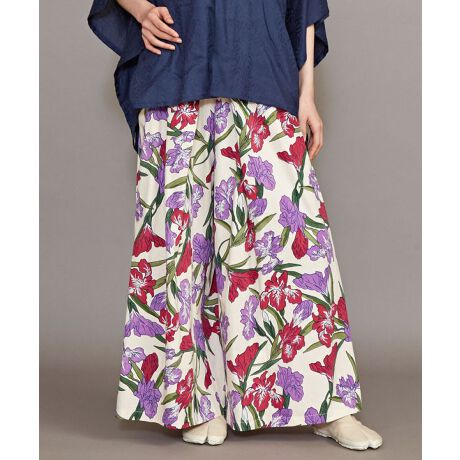 着物の隠れたお洒落「八掛(はっかけ)」と袴をイメージして作られた綿パンツ。落ち着いた色合いの生地から覗く華やかなデザインがとてもお洒落です。軽い綿素材で着やすく、大きく広がった形は袴のよう。ウエストはゴム入りで履きやすいです。あしらわれている菖蒲は日本の千代紙の模様を使用。