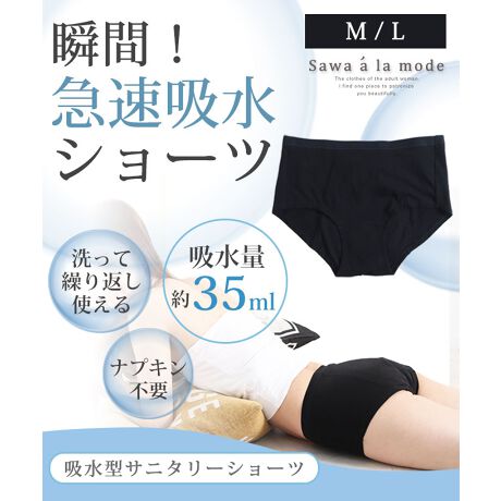 瞬間!急速吸水型サニタリーショーツ。生理期間も快適に過ごせる急速吸水型で様々な不安に寄り添ってくれます。薄型なのに3層構造のシートは驚きの35mlの吸水量。腰まである吸水面で伝いモレのヒヤヒヤ感無く穿いて頂けます。M・Lのサイズ2展開で体型に合ったサイズが選べます。