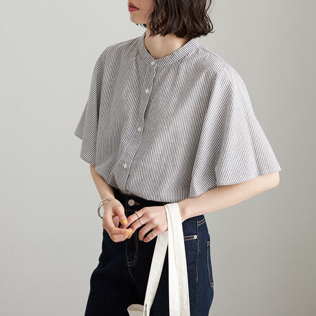 女性らしさを高めるデザインブラウス。爽やかな細ストライプ生地で