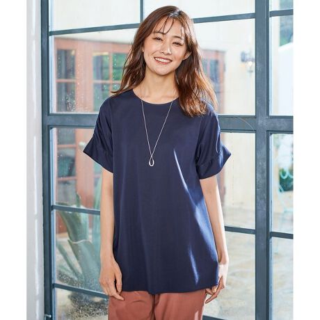 トレンドのフレアーシルエットに長めの丈感で大人っぽく仕上げたカットソー。前はシンプルなデザインですが、後ろをイレギュラーなカットにしたデザインTシャツです。袖には程よくシャーリングデザインを入れ、ポイントにしています。パンツの上に着るだけでサマになるアイテムです。