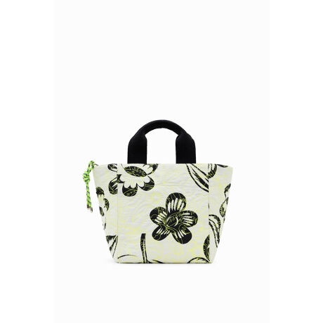 このミドルバッグにはベージュと黒い色彩の花柄プリントをあしらい、ネオンカラーの刺繍も添えました。多様なストラップが用意されているので、手に持ったり、クロスボディバッグとしても使えます。軽くて手触りの良いふかふかアイテム。