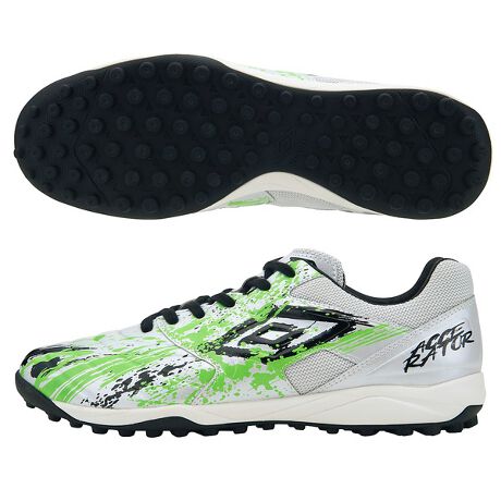 『ACCERATOR』シリーズの人工芝対応フットサルシューズ 。ジャパン企画のワイドラスト。前甲部分の縫製をなくし、足馴染み感を高めるノンステッチパターンを採用。ターフコート向けソール。クッション性・反発性を考慮したインジェクションEVAをミッドソールに採用。約270g(27.0cmで計測)